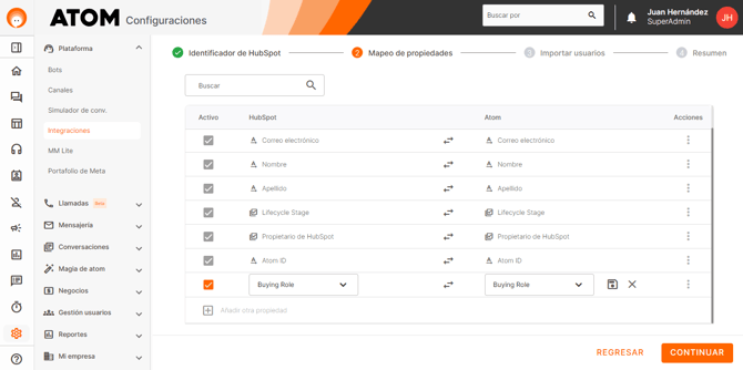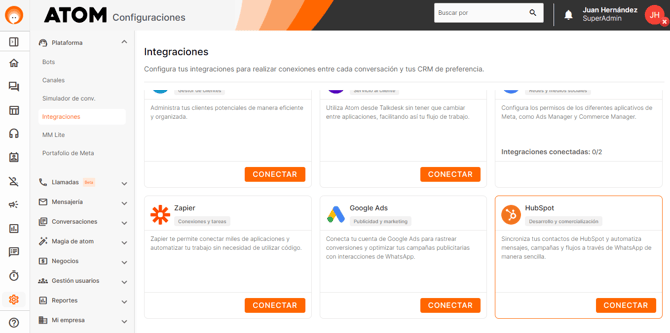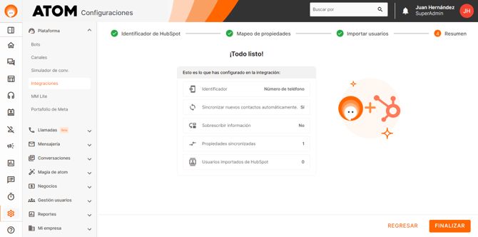 Al finalizar, serás redirigido a la pantalla de Configuración de HubSpot dentro de Atom, donde deberás visualizar: