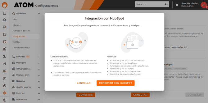 El usuario que realizó la conexión tiene permisos de Super Admin en HubSpot. -
