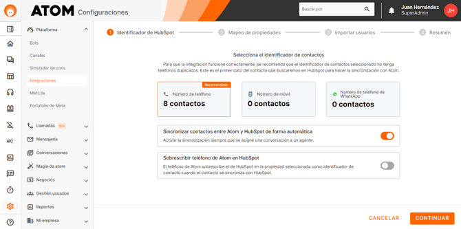 (Atom actualiza el número en HubSpot si detecta diferencias).