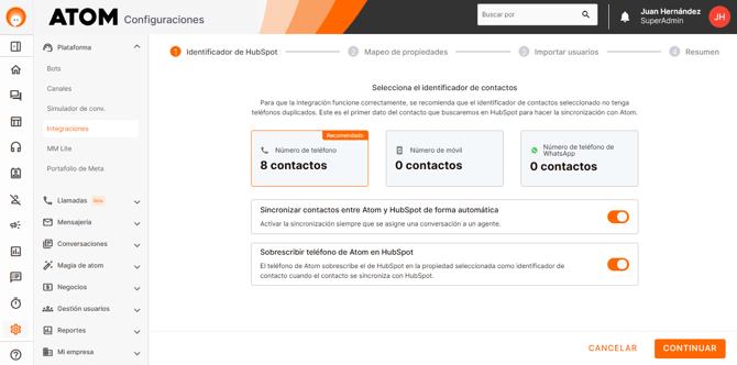 IMPORTANTE: No se traerán todos los contactos del CRM automáticamente a la plataforma, ni todos los contactos de la plataforma serán enviados al CRM. Esto sólo sucederá cuando sean asignados a un agente del lado de Atom, o cuando haya una actualización del lado de HubSpot, ya sea a través de workflows, webhooks, plantillas, o la actualización de algún dato como el número de teléfono, el nombre o el lifecycle stage. Este tipo de eventos si hacen que se creen clientes en Atom desde el CRM.