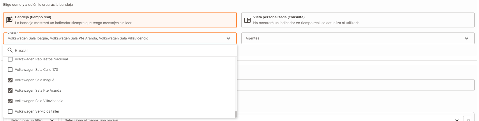 - Se deben seleccionar los filtros que formarán la bandeja o vista que será asignada a los agentes o grupos.