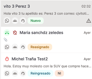 - Estado de la conversación (Nuevo, Abierto, Reingresado, Reasignado).