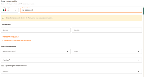Al hacer clic en Crear conversación, verás un campo para buscar por número de teléfono.