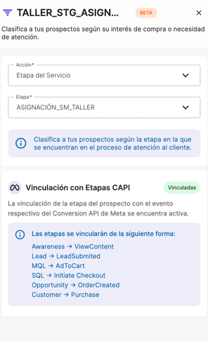 - Al habilitar CAPI a nivel cliente, el envío de eventos se realiza automáticamente para etapas de prospectos (Lead Stage).