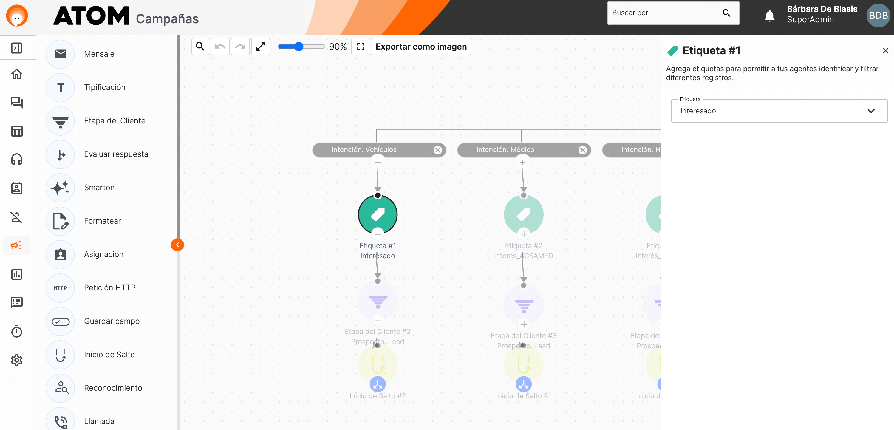 El componente Etiqueta permite asignar etiquetas a una conversación dentro del flujo, facilitando la organización, el análisis y futuras acciones de marketing, ventas o atención al cliente en Atom.