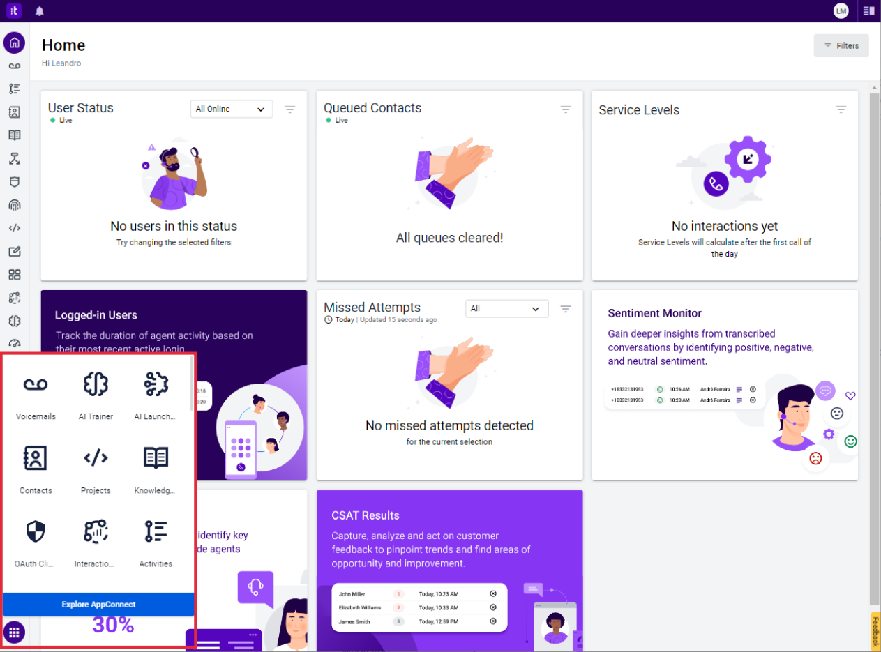 Clique em Explore AppConnect para abrir o painel de aplicativos e soluções do Talkdesk.