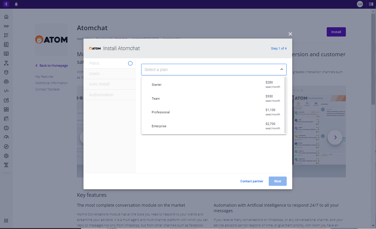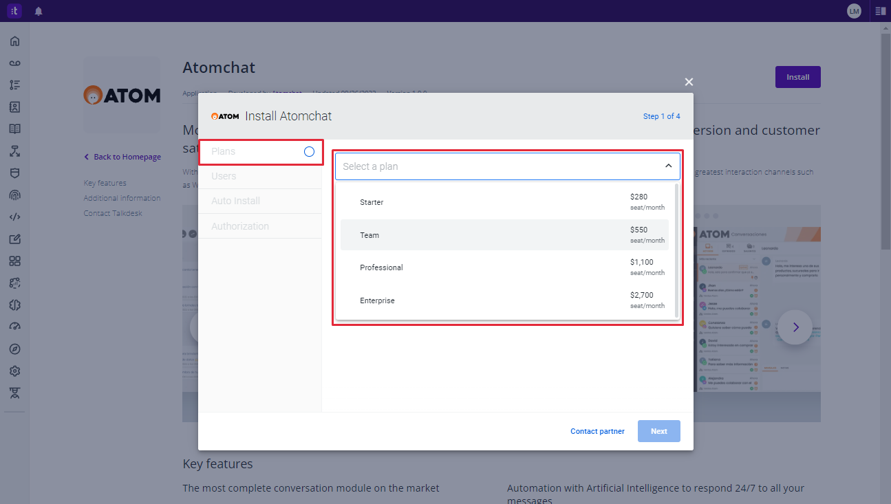 - Localize o aplicativo Talkdesk na Atom e clique no botão Conectar.
