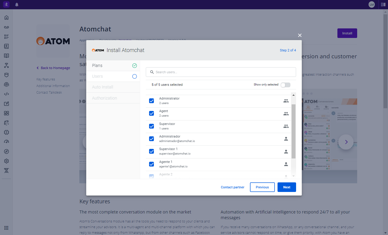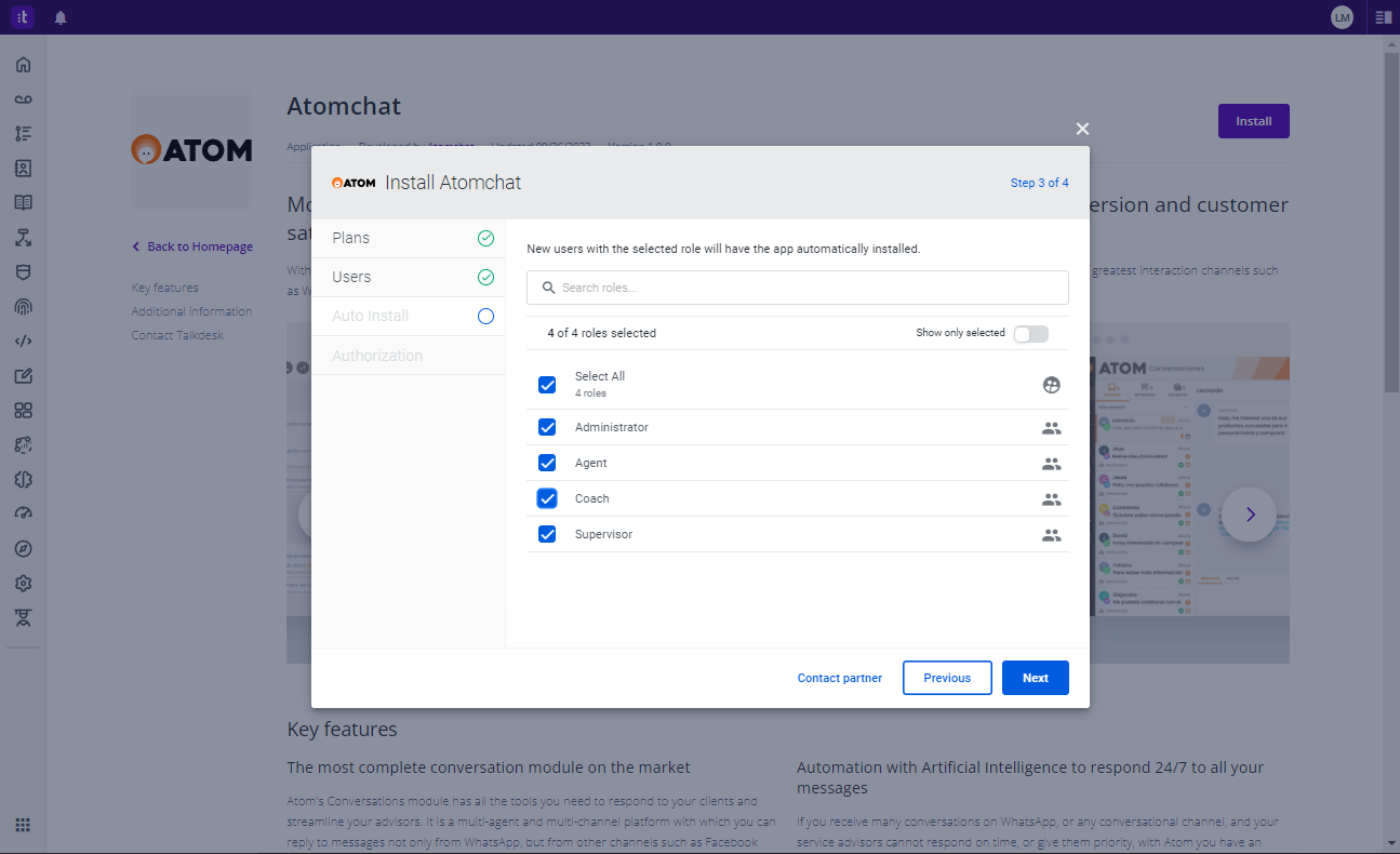 Auto Install: selecione os papéis para os quais a integração será habilitada automaticamente sempre que novos usuários forem criados com esse papel na Talkdesk.