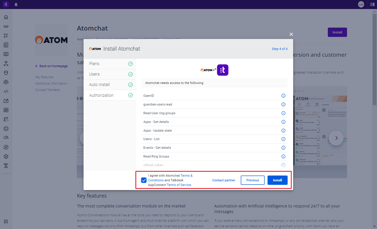 Authorization: para finalizar a integração, marque a caixa de aceitação dos Termos e Condições da Atom e dos Termos de Serviço da Talkdesk.