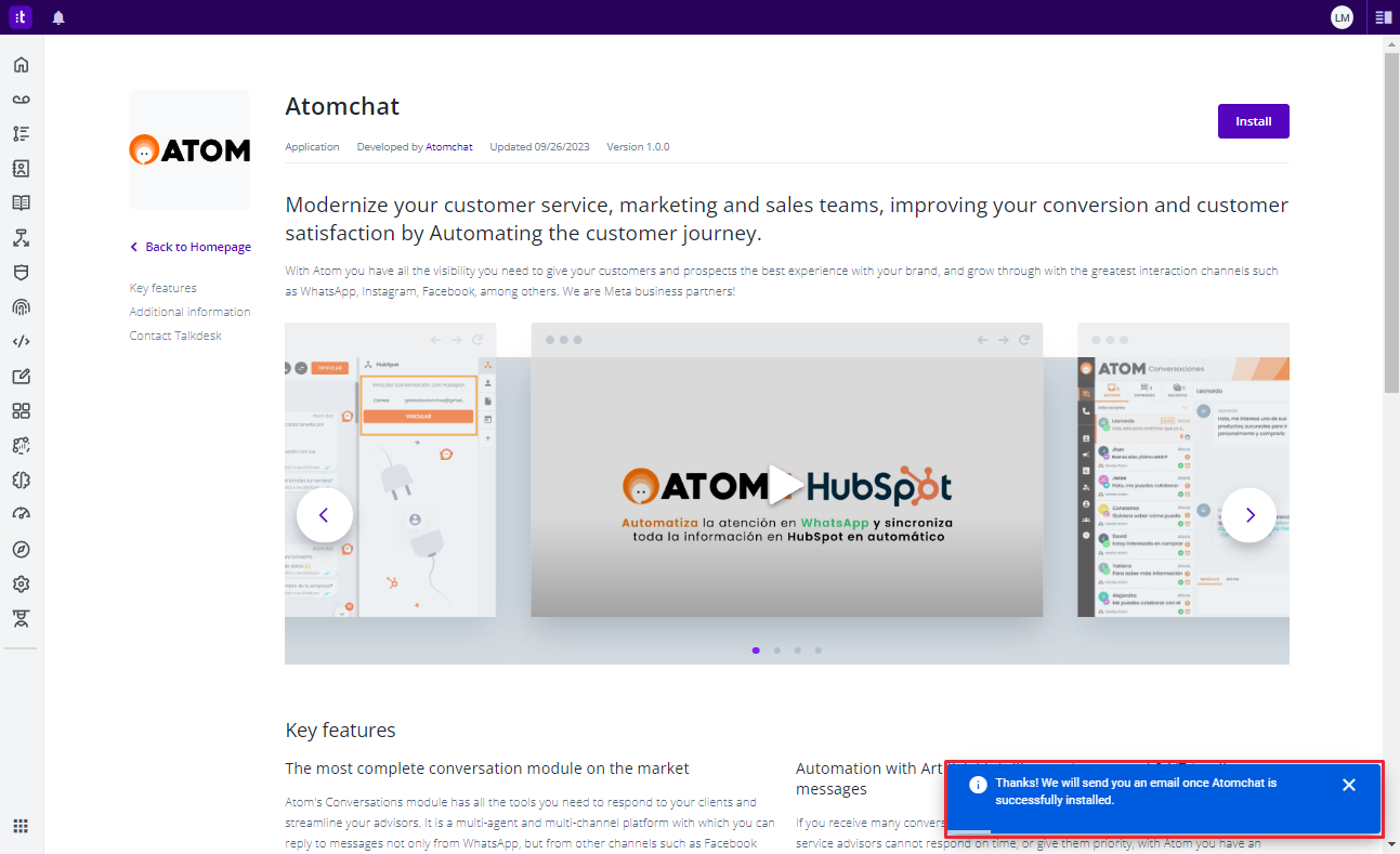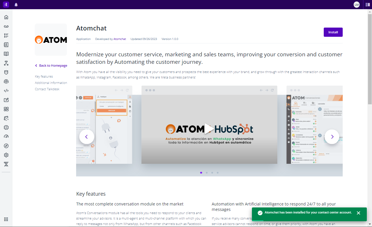 Finalização da integração – Módulo de conversas da Atom integrado a Talkdesk.