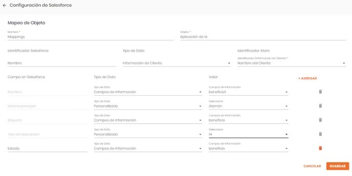 Conforme mostrado na imagem, é possível mapear os campos do Salesforce na Atom:
