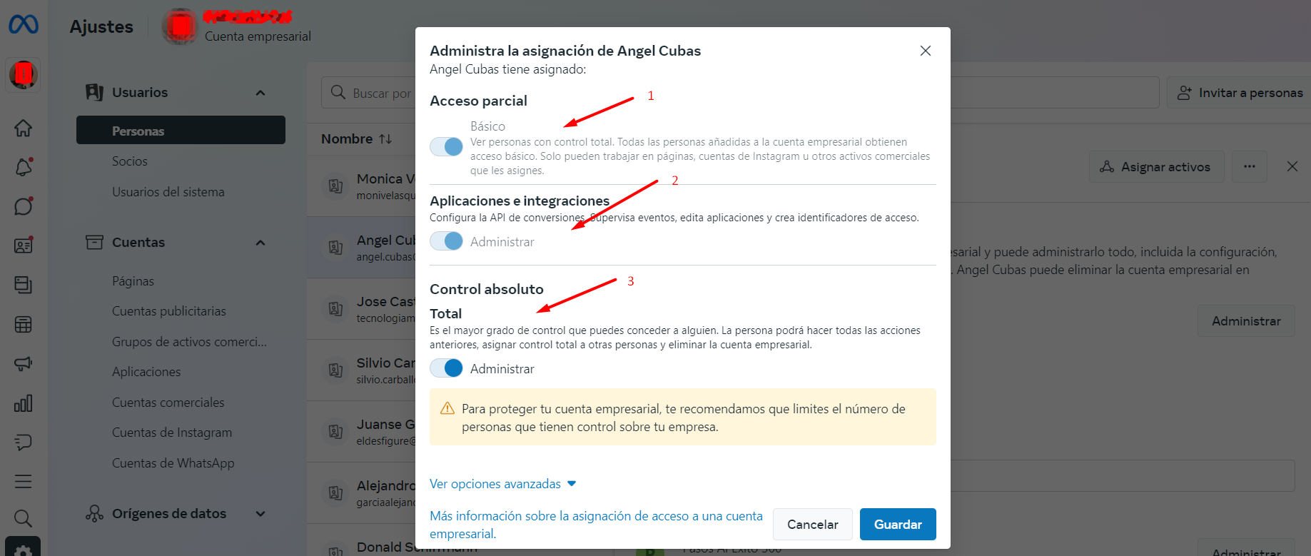 - En la sección de Configuración del negocio → Personas, asegúrate de que el usuario tenga habilitados los permisos de Aplicaciones e integraciones.