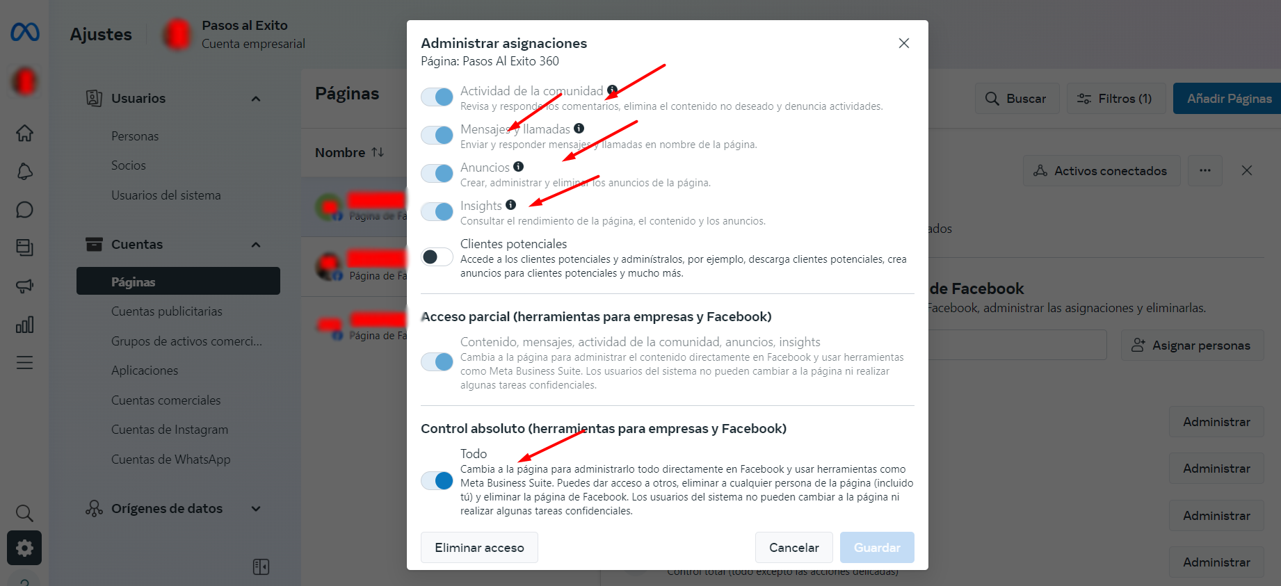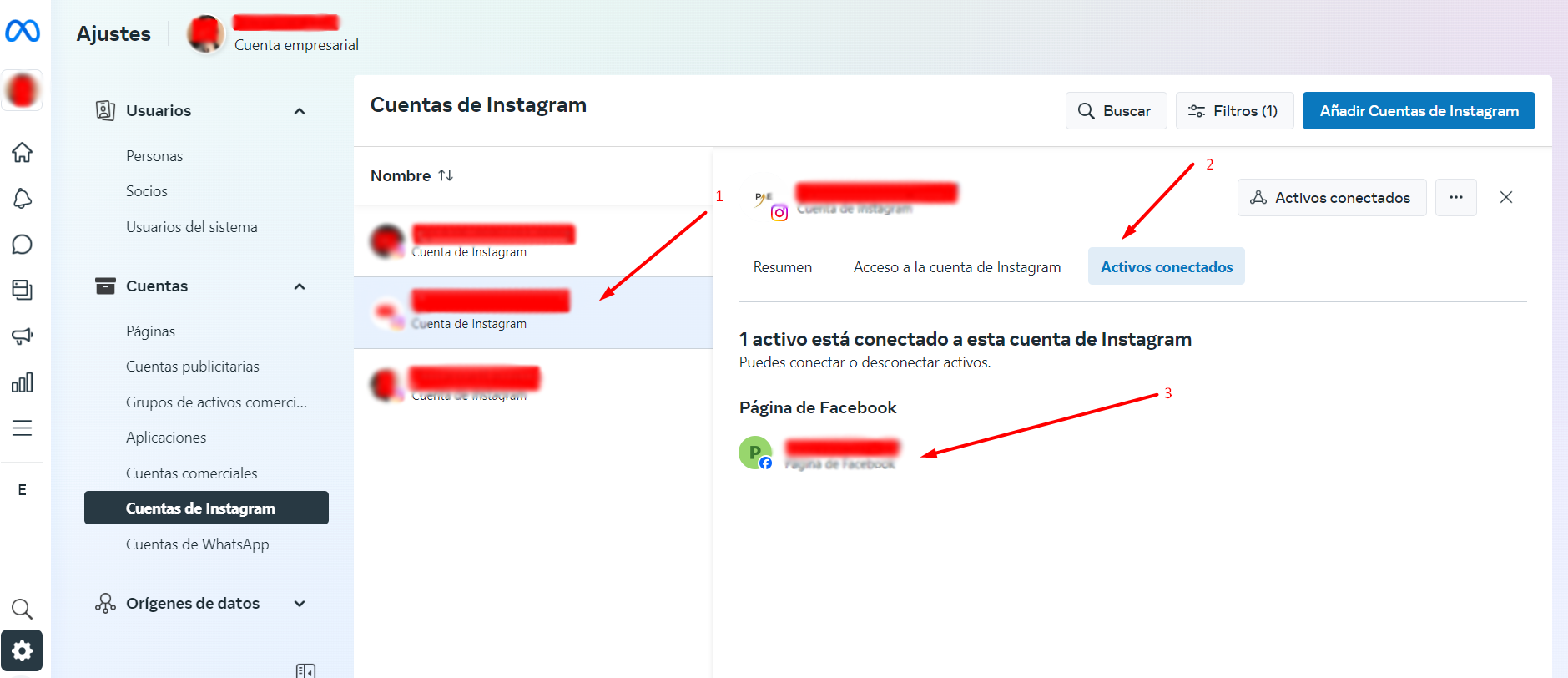 - En la sección de Activos conectados, valida que la página o cuenta de Instagram aparezca correctamente vinculada.