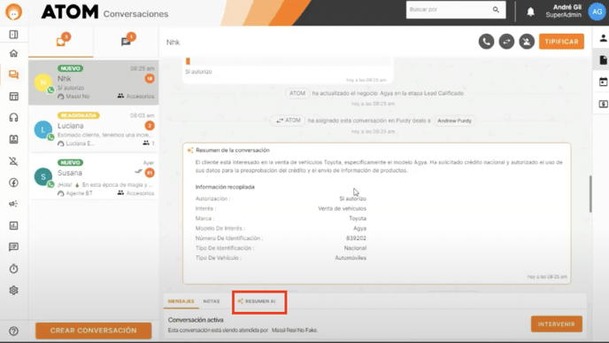 IMPORTANTE: Ten en cuenta que se necesita un mínimo de 5 mensajes (sin que se reinicie la conversacion con el mismo) para generar el Resumen AI, cuando es asignado desde el bot.