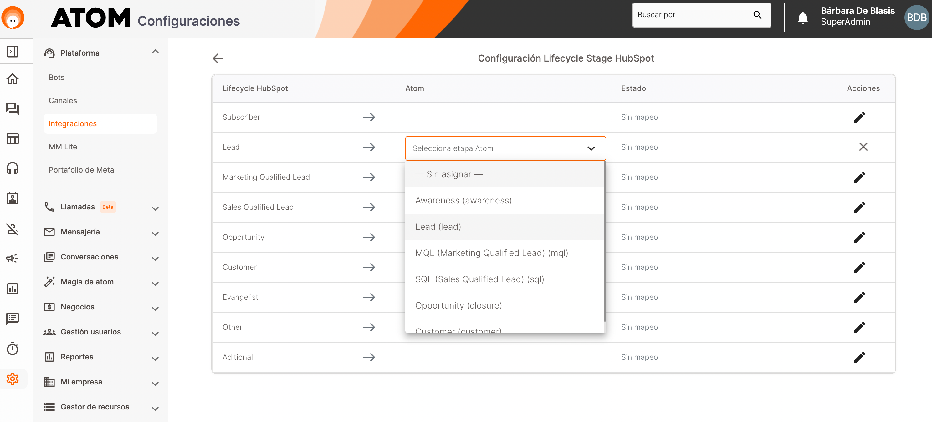 Atom listará automáticamente las etapas del ciclo de vida del contacto, configuradas en HubSpot.